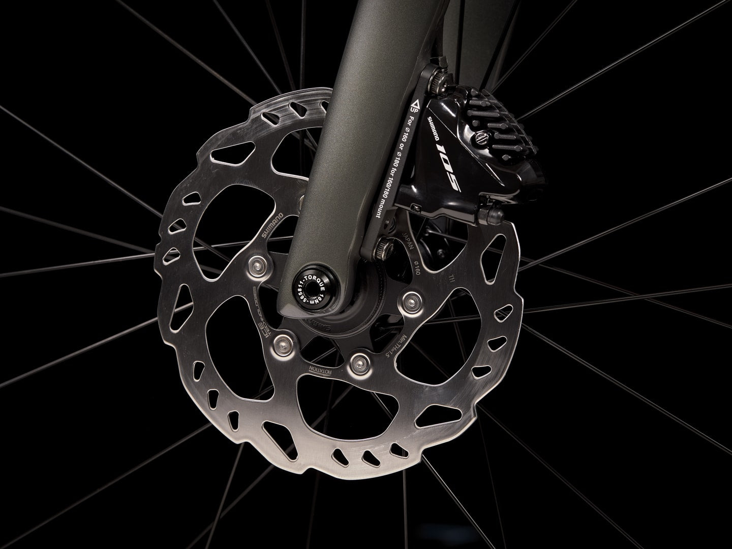 A lightweight and aerodynamic 500 Series OCLV Carbon frame and fork, a full Shimano 105 11-speed drivetrain, powerful flat-mount Shimano hydraulic disc brakes, internal cable routing for clean looks and Bontrager Paradigm SL Tubeless Ready wheels.