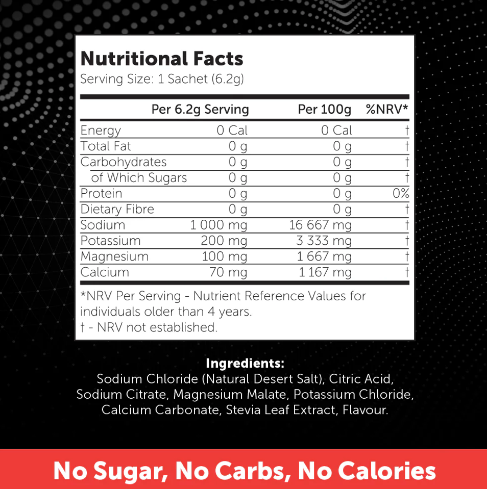 We use real, unprocessed salt from the ancient Kalahari Desert, complete with trace minerals. Our flavours are natural and carefully sourced. And our electrolyte levels are scientifically backed, with more sodium and magnesium than usual, and enough potassium to hydrate cells but not interfere with heart rhythm.