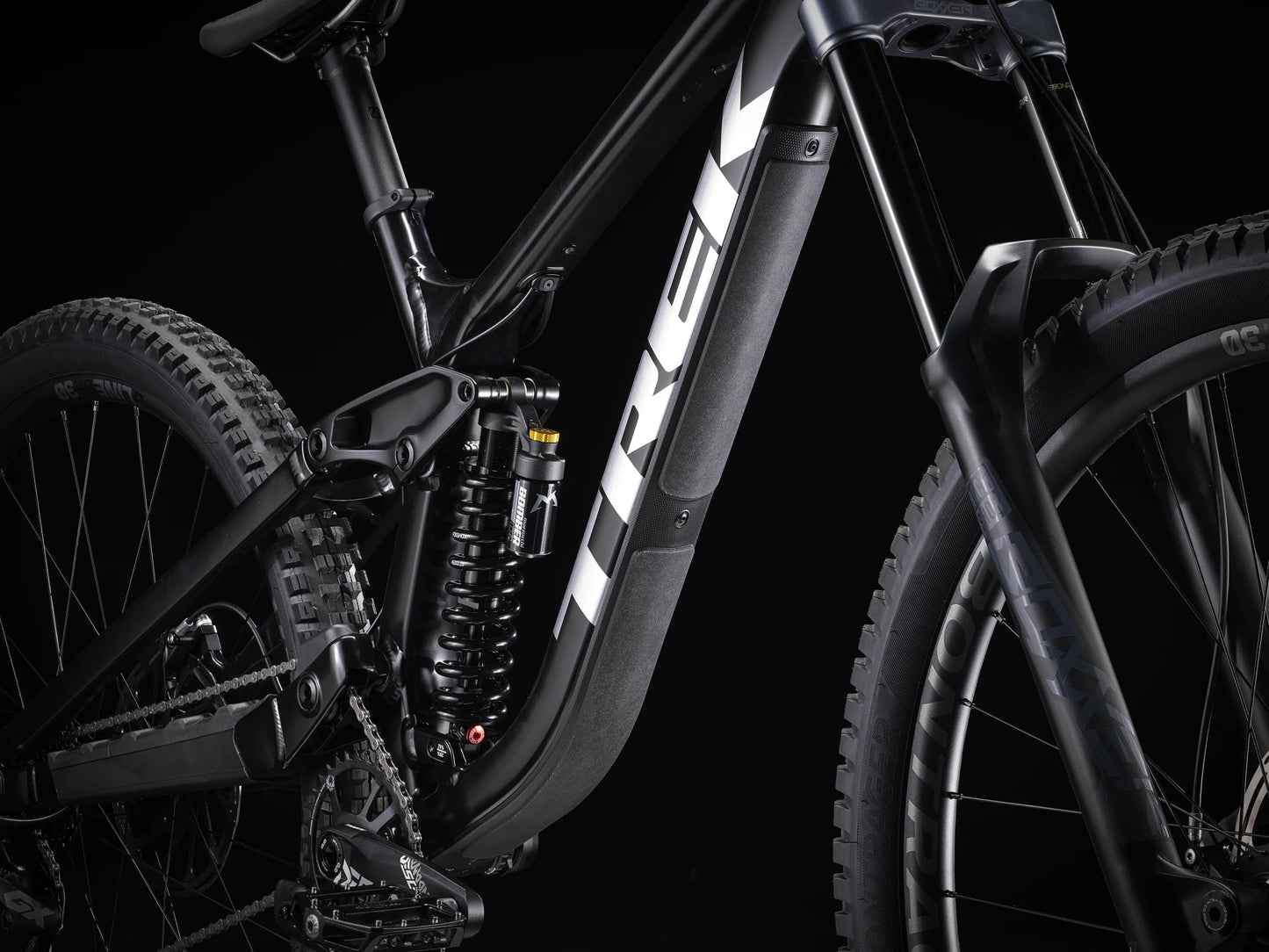 A burly alloy frame, 200 mm rear travel with a Marzocchi Bomber shock, 200 mm RockShox Boxxer Select with plush Charger RC damper, powerful Code R 4-piston brakes and a SRAM GX 7-speed drivetrain.
